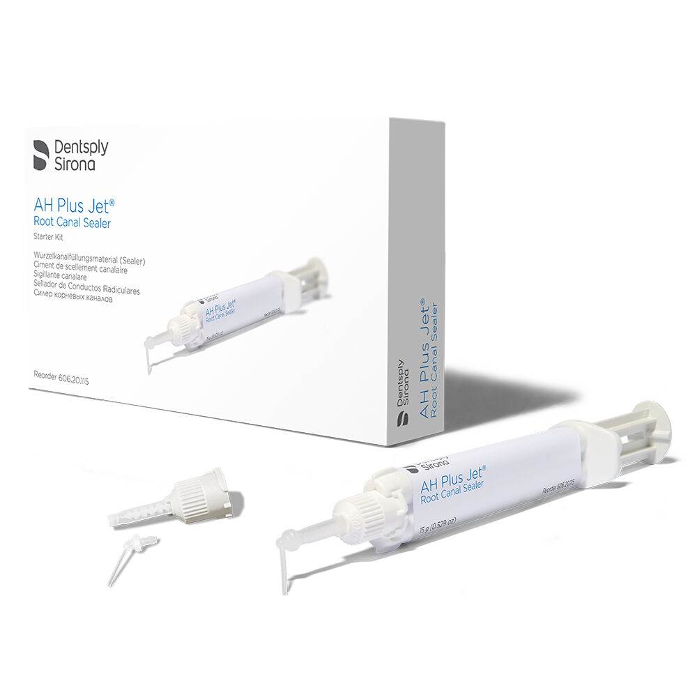AH Plus is a radiopaque, eugenol-free,two-component paste/paste permanent root canal sealer based on epoxy-amine resin, compatible with warm and cold guttapercha techniques. Biologically inert, antimicrobial when fresh. Tight sealing: Low shrinkage, low leakage and a high adhesion to dentin. Permanent obturation of root canals in combination with root canal points. Store at room temperatures 10-24°C. Package contains: 15g AH Plus Jet automix syringe, 20x mixing tip, 20x intraoral tips, mixing pad, accessories.
