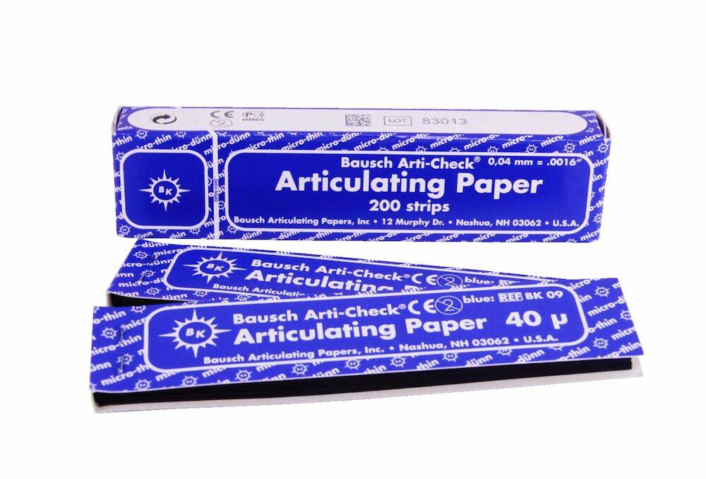 Progressively coloured articulating paper for identifying bite force through colour change according to masticatory pressure. Thickness 40 micron. For final check micro thin paper.
