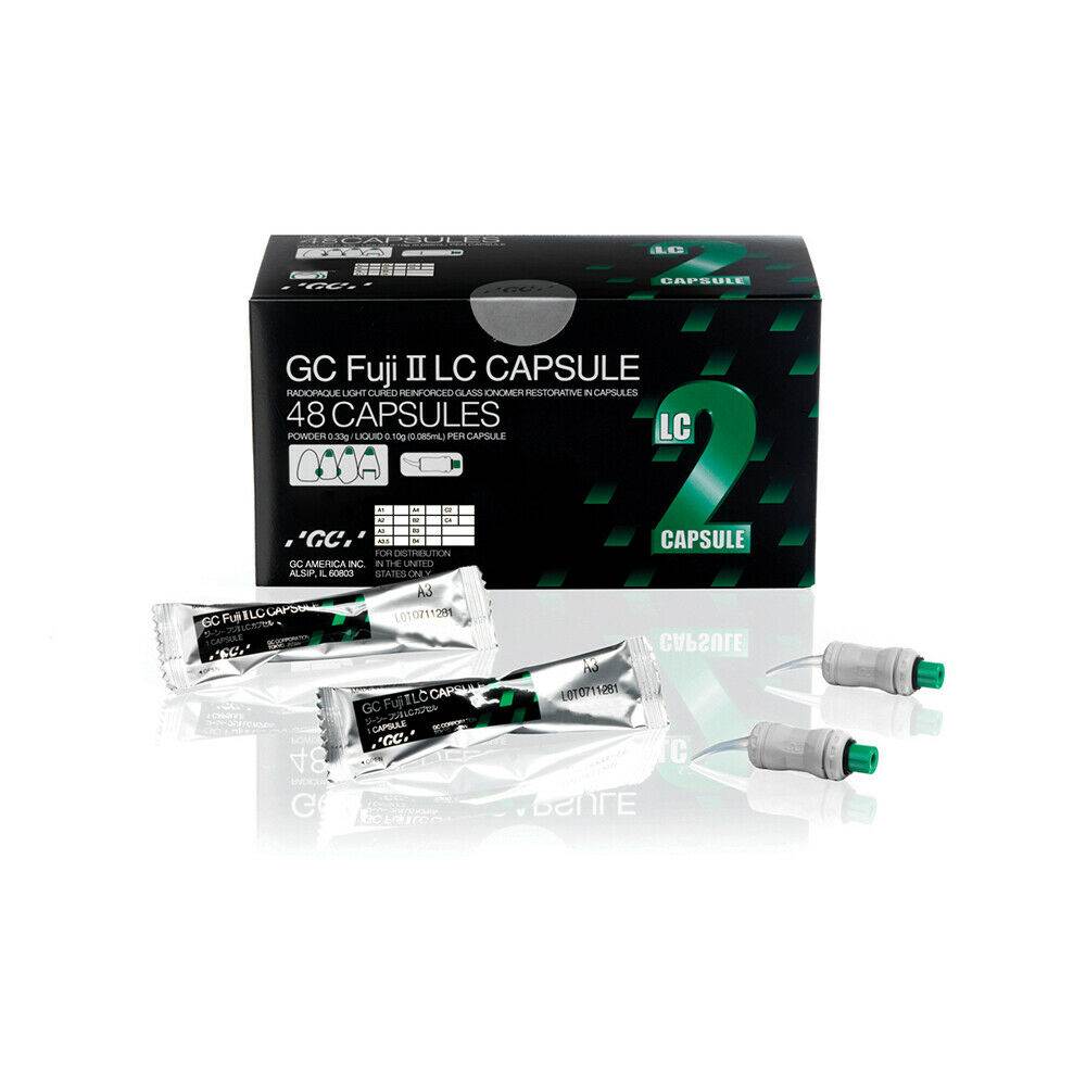 Dual curing glass inomer . With its simple, time-saving technique it is the ideal solution for many indications. Fuji II LC prevents marginal leakage, eliminates sensitivity and provides provides protection in high-risk patients. Small particles offering excellent aesthetics and polishability. Higher filler loading for significantly improved abrasion resistance. Good radiopacity to facilitate postoperative diagnosis. Self-adhesive and hydrophilic. In capsules.