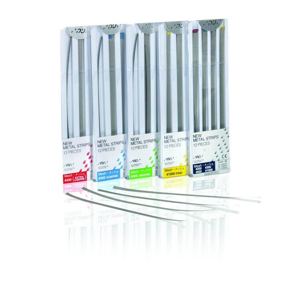 GC Metal Strips are ideal for trimming and finishing interproximal surfaces such as: composites, glass ionomers or metal restorations. The fact that they will not stretch or break is what makes them unique from other brands. The excellent wear resistancy and superior abrasive bonding allow wet finishing, which assures long-lasting and repeated use. The GC New Metal Strips are sterilizable and autoclavable. Contains 4pc yellow fine (50 micron) strips each of widths 2.6mm, 3.3mm and 4.0mm.
