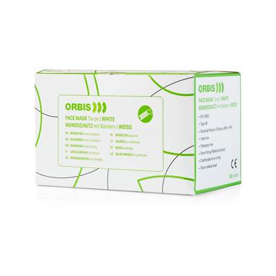 III-layer tie on mask Type IIR, White, latex and fiber glass free. EN 14683:2019+AC:2019, BFE >98%