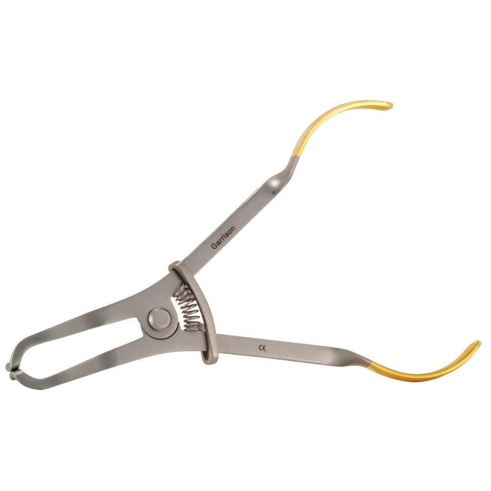 Universal forceps with a patented tip design that works with all currently available sectional matrix rings and rubber dam clamps.